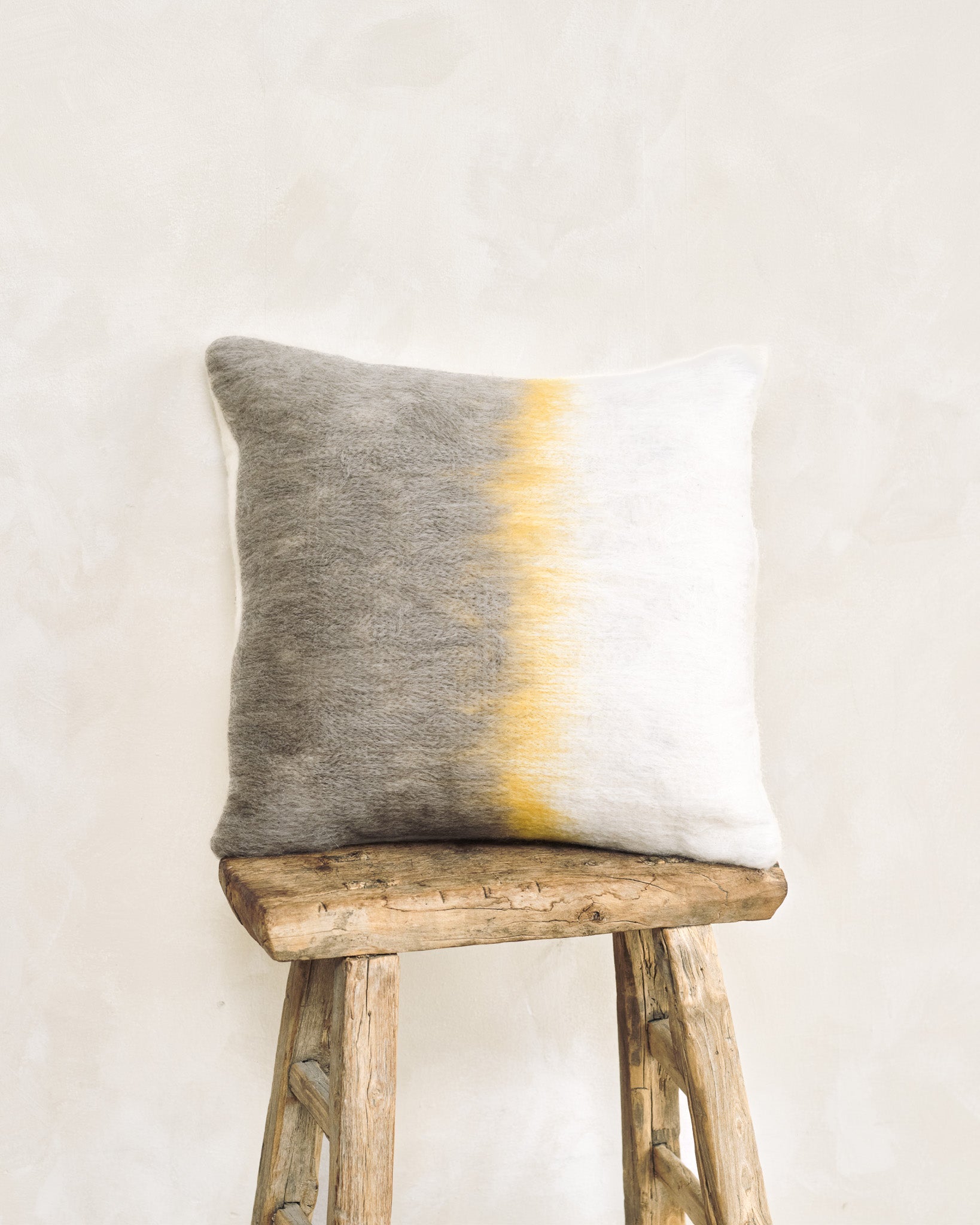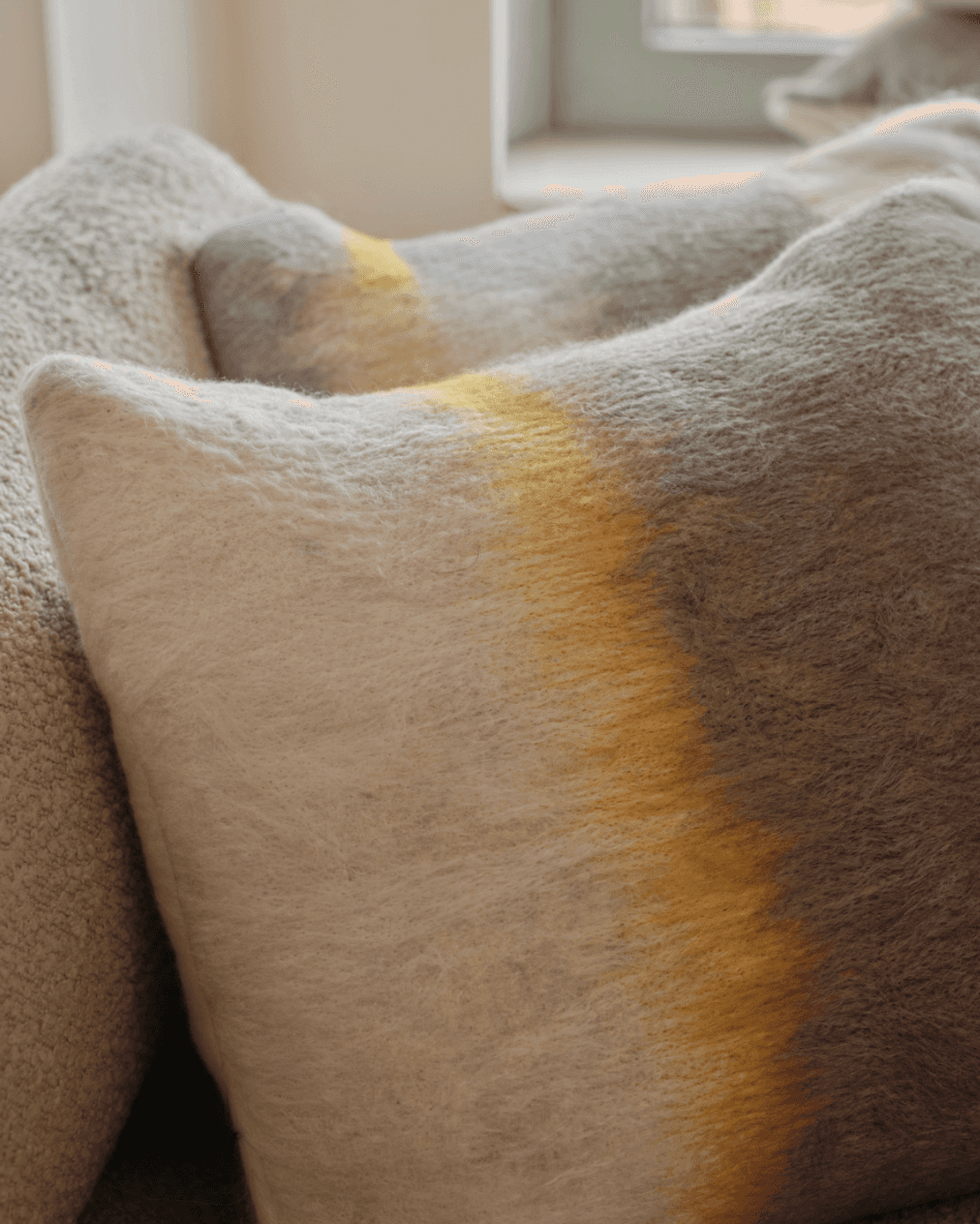 Soft gradients of earth and light meet in this hand-felted pillow. Inspired by the quiet radiance of dawn, its natural wool textures and warm tones evoke a gentle glow–grounding yet luminous, timeless in form and feel.