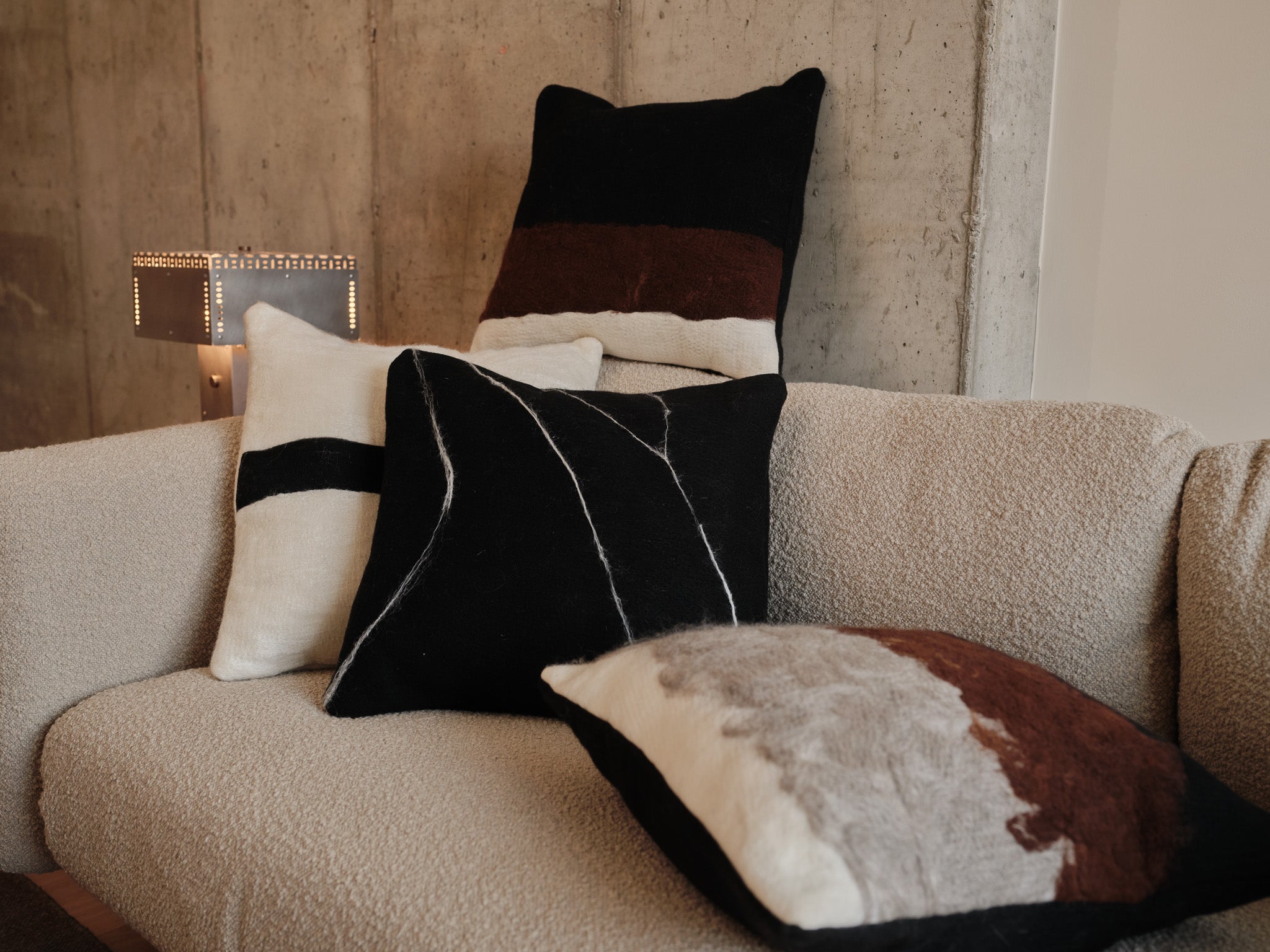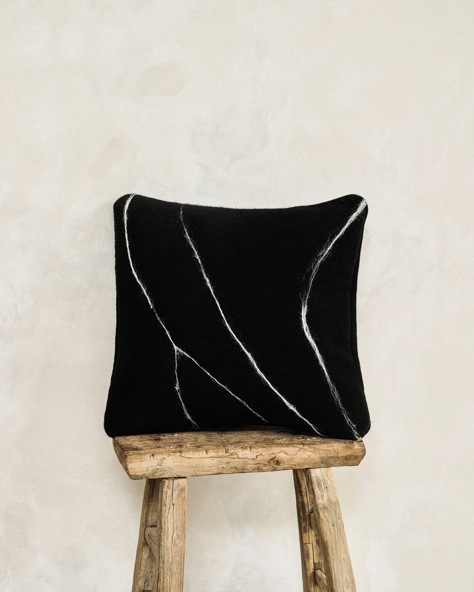 The Nero e Seta Pillow pairs rich black merino wool with streaks of silk. Inspired by the elegance of marble veining, this piece brings both modern edge and timeless luxury to any space.