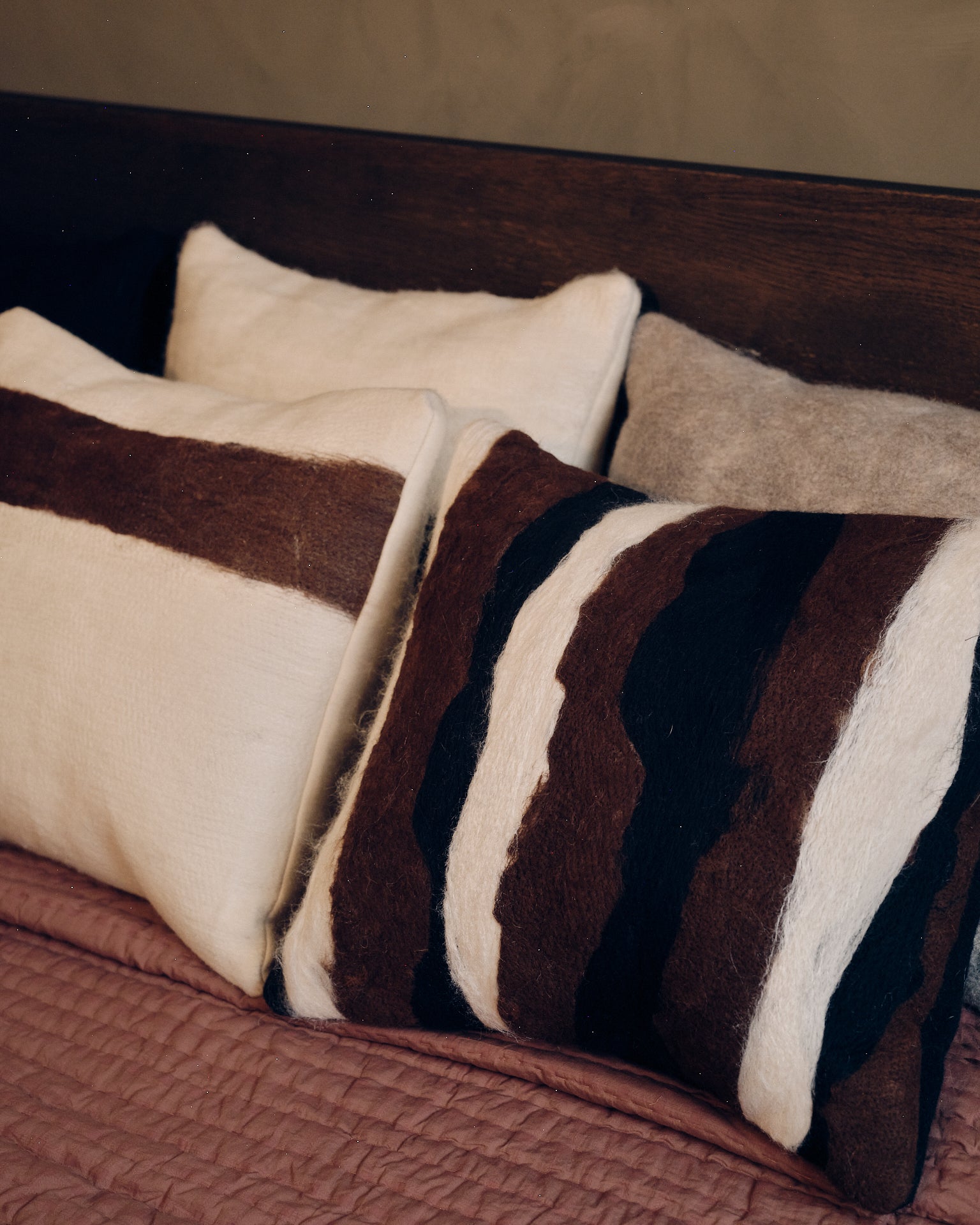 Rich and grounding, the Terra Castano Pillow draws from the chestnut earth. Its wavelike bands of brown, black, and cream evoke the timeless layers of the land.