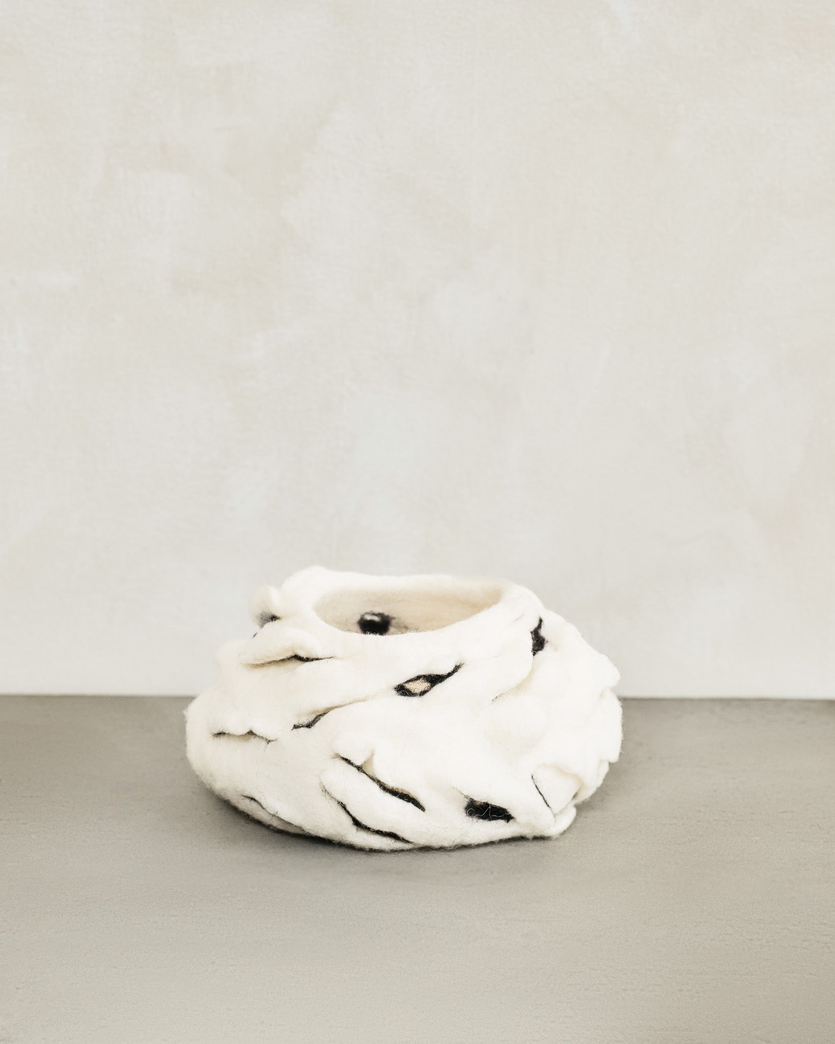 Ìhò holds the weight of earth and body. Hand-felted in soft, sculptural folds, its openings and cavities reveal quiet depths—echoes of what rests beneath the surface. The vessel invites a slow gaze, offering textures and shadows that shift with the light.