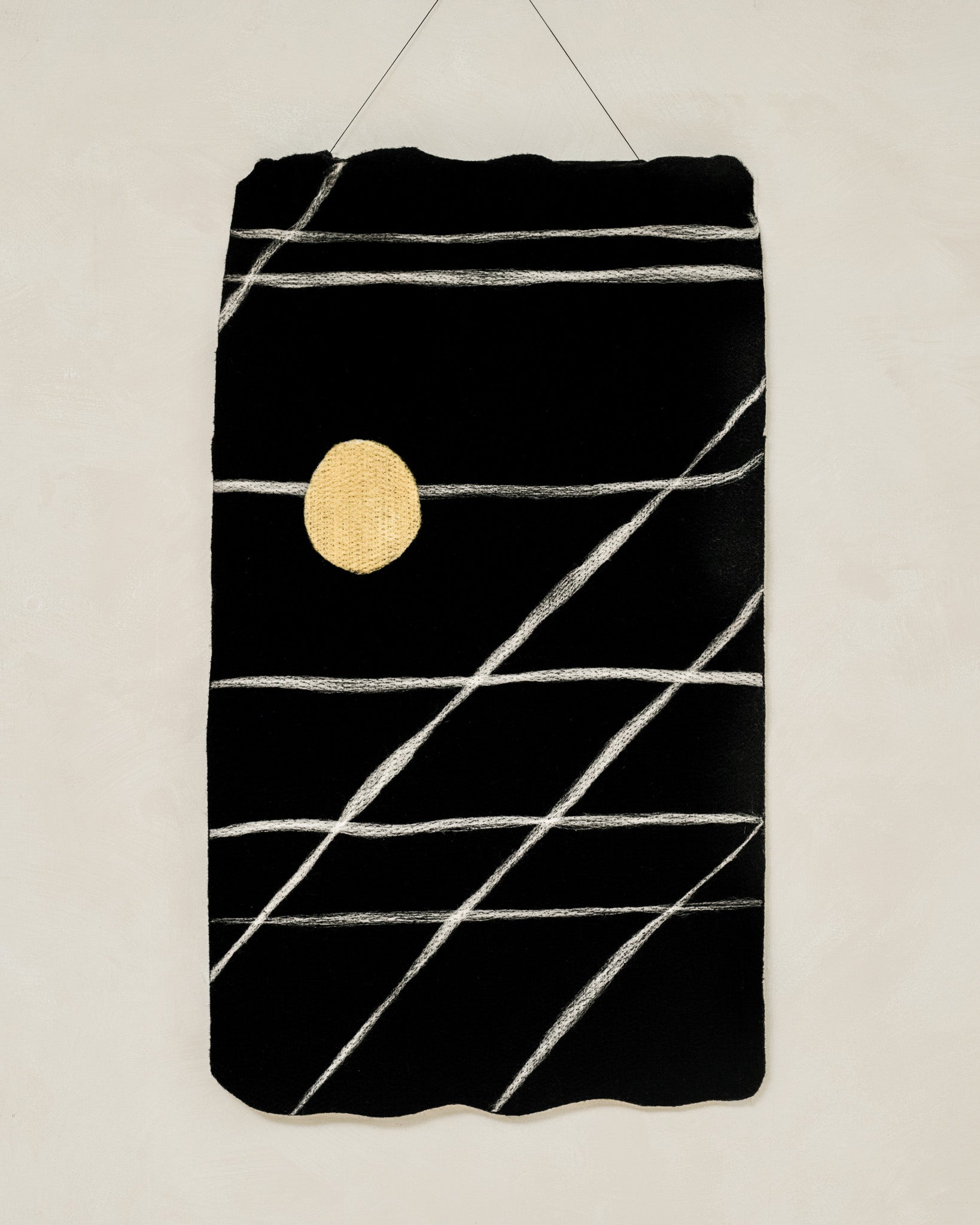 Set against a deep, night-like field, Yellow Moon explores balance and quiet illumination. Linear marks suggest pathways or horizons, while the glowing moon anchors the piece—evoking guidance, pause, and reflection within darkness.