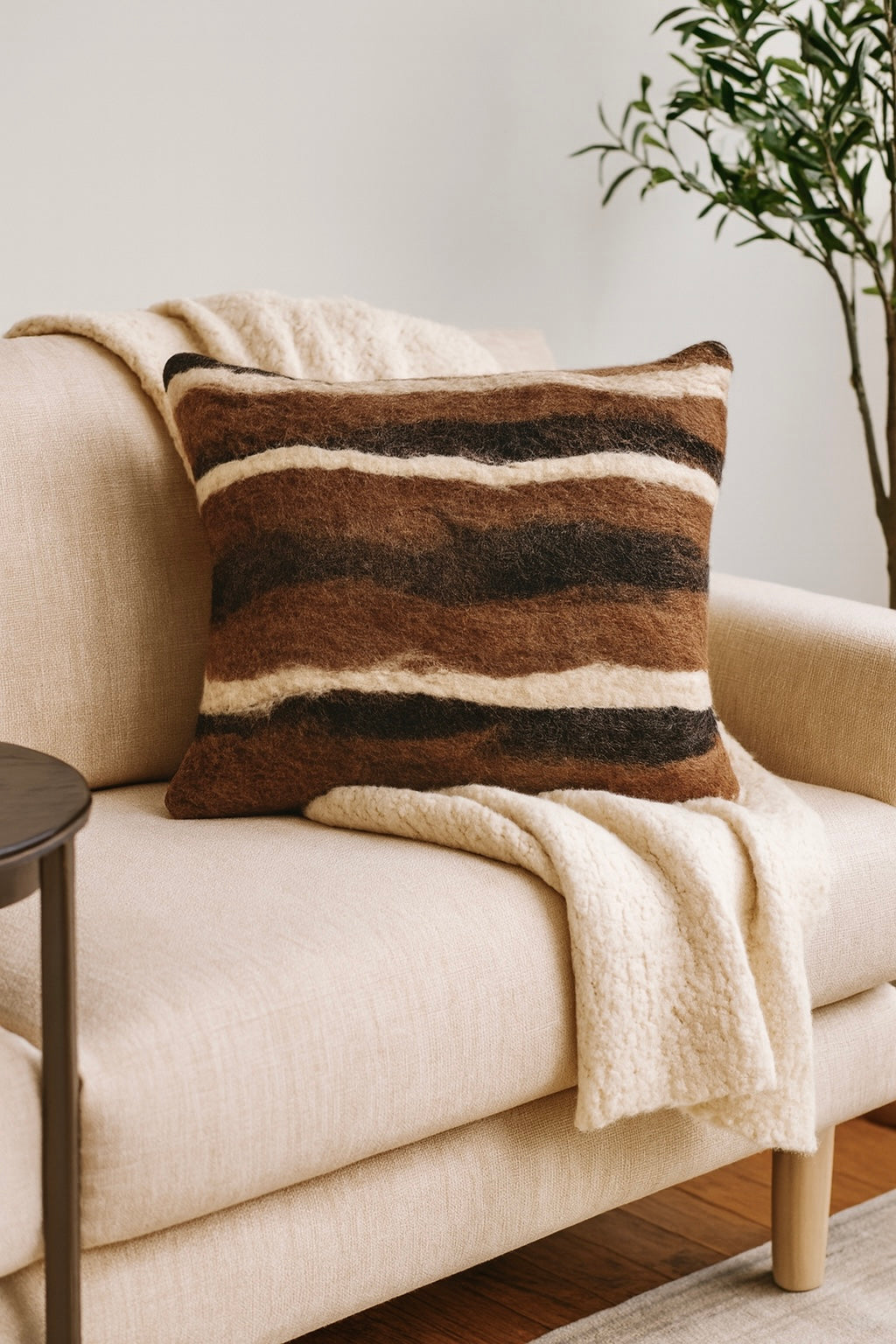 Elevate your space with the timeless artistry of felt. This handcrafted pillow brings warmth, texture, and understated luxury to any room. Each pillow is made using the traditional art of felting, blending organic fibers into a unique design that celebrates natural beauty. No two pillows are ever the same—slight variations in color and texture are part of their charm, making each one truly one of a kind.